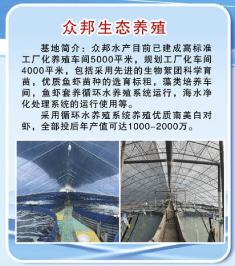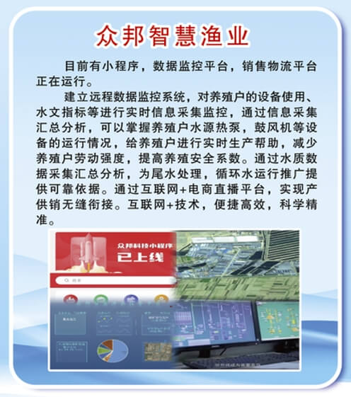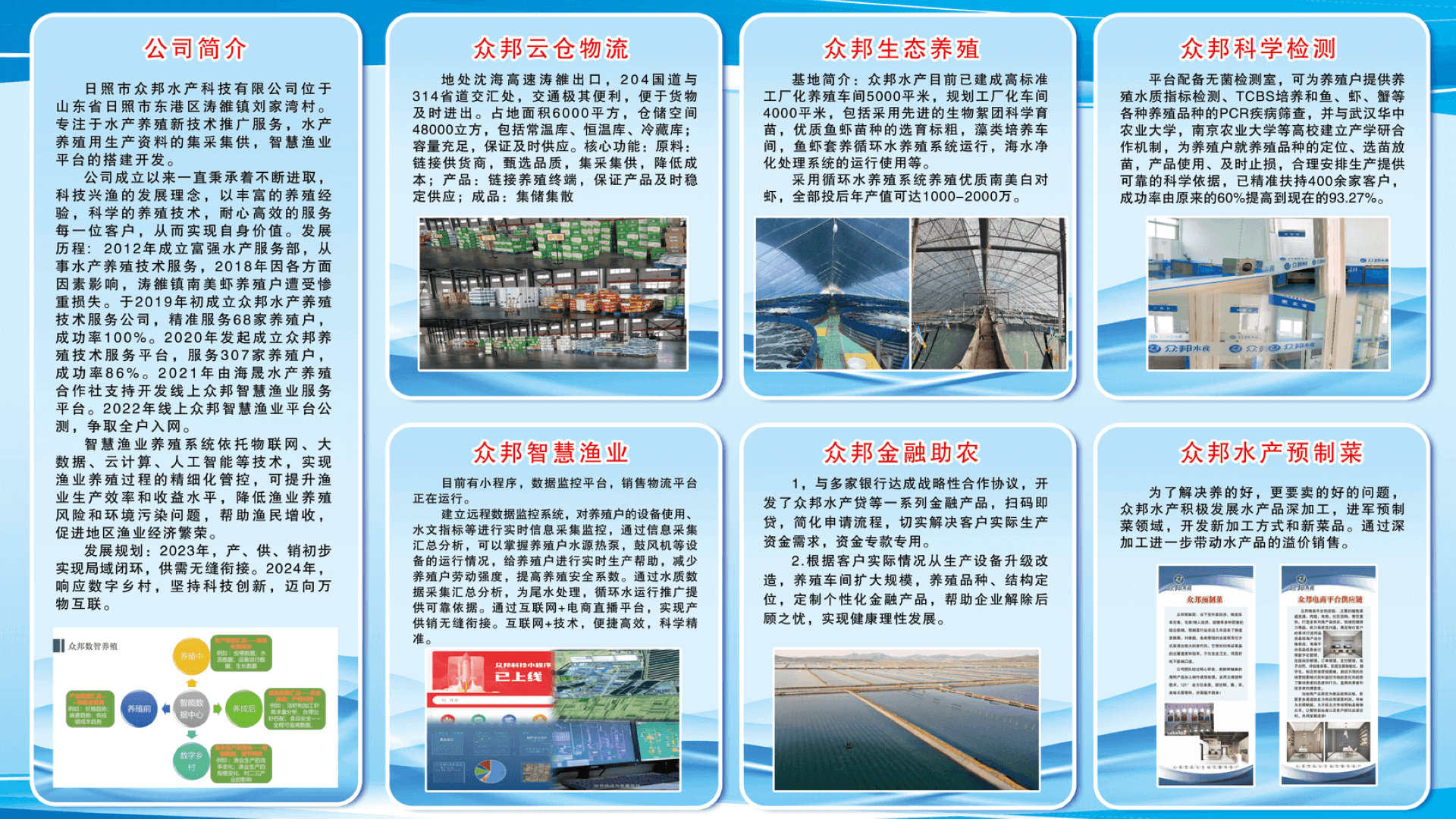 日照众邦科技有限公司成立于 2022 年 6 月,位于日照市东港区涛雒镇赶海御苑,拥有独立办公大楼一栋,已搭建一套完善的智慧渔业服务平台。目前已经投入建设一个智能化运营中心;一个物流仓储中心,仓储周转超5000 吨;一个智能循环水养殖场,占地面积 18668 平方米,规划循环生态生产养殖车间10 栋,水体近 10000 平方,年产优质虾苗超 10 亿尾,优质鱼苗 100 万尾以上;一个水产预制菜电商运营中心;链接 400 多名一线养殖群体,带动周边养殖水体超10 万方,助力乡村振兴,农民致富。每年可通过大数据分析,提升水产养殖成功率10%以上,减少损失超千万以上,带动行业产值超 2 亿元!
